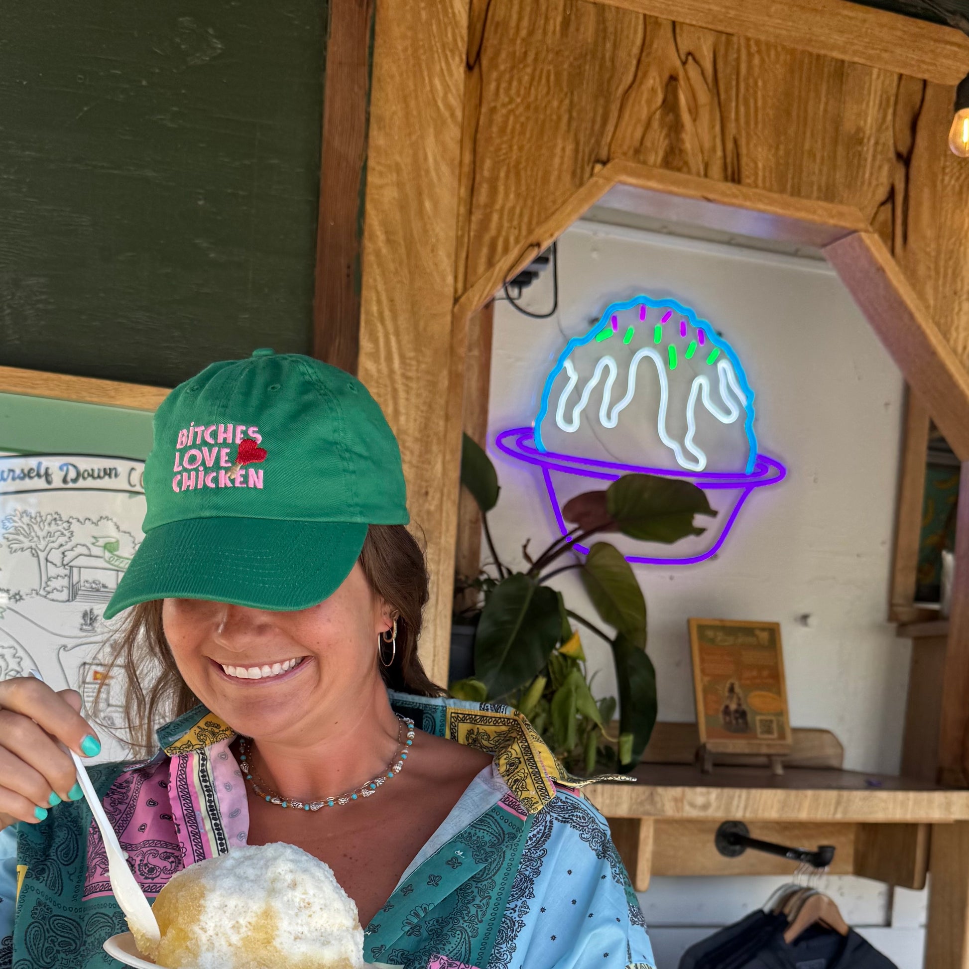 This hat started as a joke and quickly became a movement. Somewhere between a spicy michelada and a good ol' Costco rotisserie, the “Bitches Love Chicken” hat was born. She’s bold, unapologetic, and profoundly iconic.